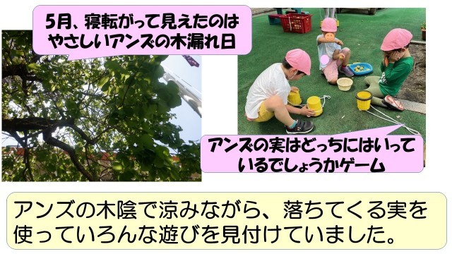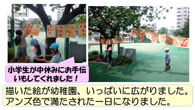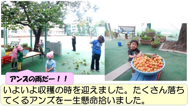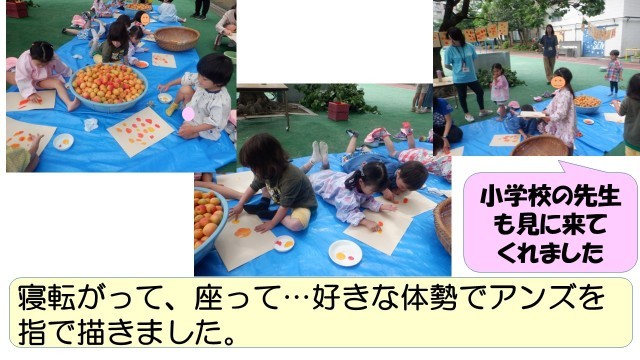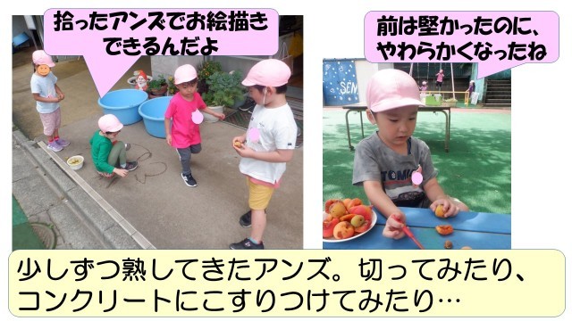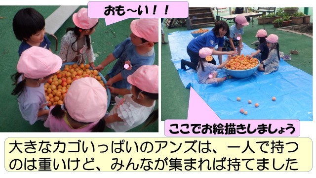 たくさんのアンズ 公開日 2025/06/24 更新日 2025/06/24 臨川幼稚園の子供たち 4月から緑色のアンズが少しずつ大きくなるのを遊びながら感じてきました。6月、オレンジ色でところどころ赤く熟したアンズがたくさん実り、子供たちにうれしい恵みをくれました。こんなになるのは珍しい、ということでばら組の入園をお祝いしてくれたようですね。遊びに、製作に、たくさんアンズと親しみました。 +4