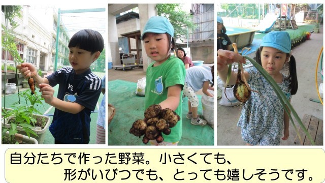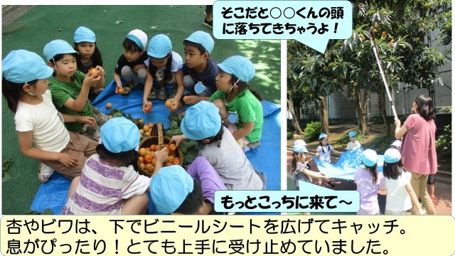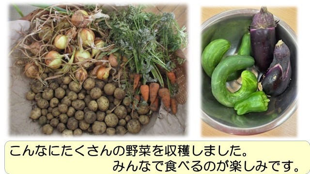 春ごろに植えた栽培物の収穫をしました。ジャガイモ、ニンジン、タマネギ、ナス、ピーマンの5種類です。土の中で育つ野菜は見えないので、「できてるかな?」と少しドキドキしながらの収穫でしたが、土の中から見つけると「あった!」「できてたよ」ととても嬉しそうでした。そして今年大豊作の杏や、びわの果物もみんなで収穫をしました。