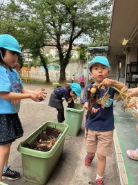 暑すぎて、できなかった園庭での遊び。少し気温が落ち着いた金曜日の朝、園庭で久し振...