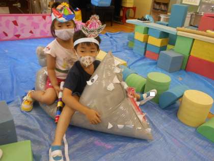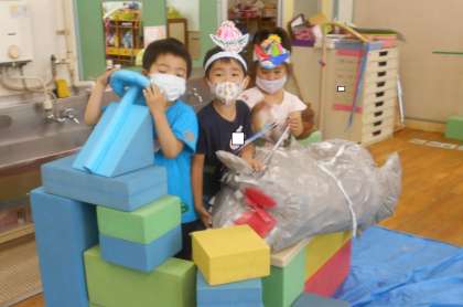 少し前から船ごっこを楽しんでいるはな組の子供たち。船に乗って魚を釣って遊んでいると、サメが来たぞ!とイメージが膨らんでいる子供たちだったので、みんなでサメを作りました。名前は“サメタロウ”!最近の遊びでは、よくサメタロウと一緒に遊んでいます。また、プール遊びが始まり楽しかった経験からプールを作りたい!と話があったので、お部屋でもプールを作って遊んでいます。