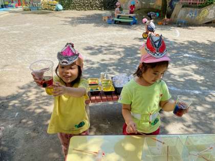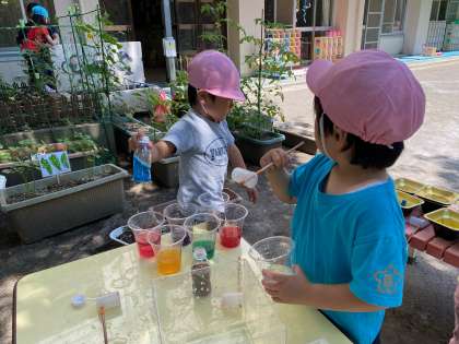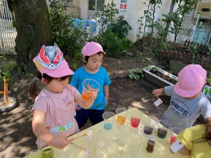 色水遊び はな組 公開日 2022/06/27 更新日 2022/06/27 お知らせ 少し前のことですが、暑い日には日陰で色水遊びを楽しみました。クレープ紙という紙で、水に入れると色が溶け出す魔法の紙を使ってジュースを作りました。赤と青を混ざたら何色になるかな?と子供たちなりに考えながら楽しんでいます。素敵なジュースの出来上がりです!