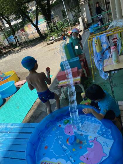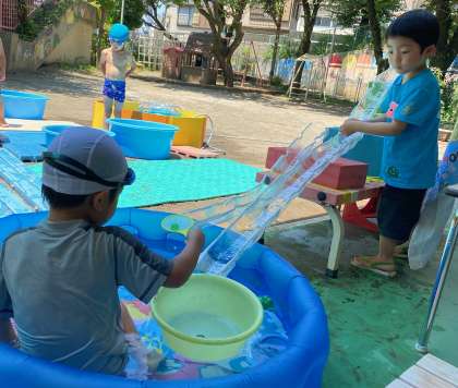 コロナ化の影響で、そうめんパーティーができずにいると保護者の方が流しそうめんの台を作ってくださいました。早速、はな組の水遊びで使いました!室内でも積み木を組み立ててて、ボールを転がすコロコロゲームを楽しんでいた子供たち。水遊びでもコロコロゲームを作り、流しそうめんの台からボールを転がして遊びました。「コロコロしたよ!」「楽しい!」とたくさんの声が聞こえてきました。保護者の皆さんいつもご協力ありがとうございます。