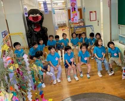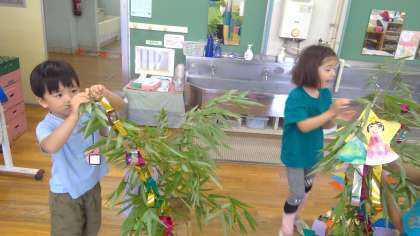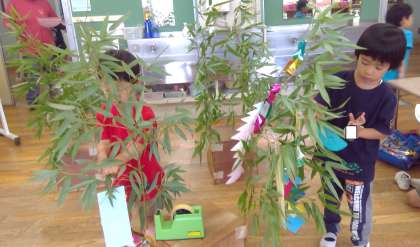 七夕集会では、年長、年少の七夕飾りを紹介し、みんなでお祝いしました。