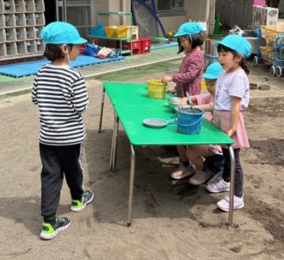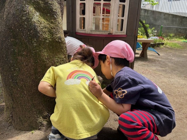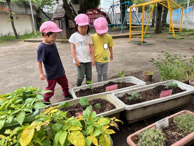 自然いっぱいの園庭で 公開日 2025/05/12 更新日 2025/05/09 お知らせ 戸外が気持ちいい季節です。砂場の上にはシートを貼り、心地いい日陰で思い思いに遊んでいます。虫や樹液を見つけて、よーく観察している子供たちです。はな組もそら組も夏野菜の苗を植えました。育つのが楽しみだね!