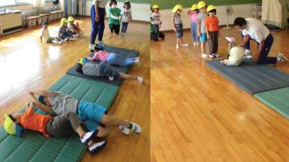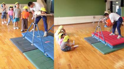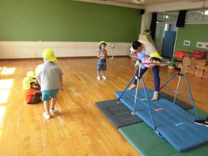 もも組は、鶴岡先生と一緒にマットや鉄棒で遊びました。マットの周りを走ったりもぐったり。マットの上をゴロゴロ転がった後は、前転にも挑戦しました。鉄棒は、まず握り方から教わりました。先生に引っ張られても鉄棒を離さないくらいしっかり握れるようになりました。鉄棒でも、自分で跳び上がることや前転に挑戦しました。先生に支えてもらって、「できた!」と子どもたちはとってもうれしそうです。これから、好きな遊びでもたくさん楽しみたいと思います。