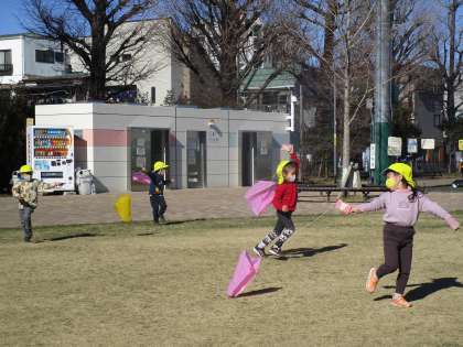 たこたこあがれ 公開日 2022/01/23 更新日 2022/01/23 子どもたちの様子 子供たちが、慎重に型をとり慎重に竹ひごをつけて、よく揚がる凧を作りました!園庭で凧揚げのコツをつかんだ子供たちと、広いいちょう公園に出かけて思い切り凧揚げを楽しみました。何度も揚げていると「こっちから走るとよく揚がる!」と風の吹く向きにも気付き始めました。寒い日でも、凧揚げをすると、暑くてどんどん薄着になる子供たちです。凧には、干支の“虎”が描かれています!子供たちの夢と希望を乗せて、たこたこあがれ♪