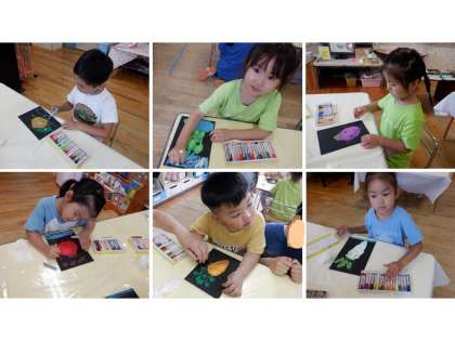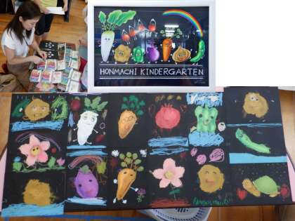 本町幼稚園のTシャツの柄にもなっている、園庭の野菜やカメ、花などを、オイルチョークで塗ったりぼかしたり。いつもと違う素材を使って描くことを楽しみました。子供たちの思いを聞き取っていくと、一人一人の絵に素敵な物語があります。とっても色鮮やかに出来上がり、「もっと描きたい!」と子供たちでした。また、経験できる日を楽しみにしています!