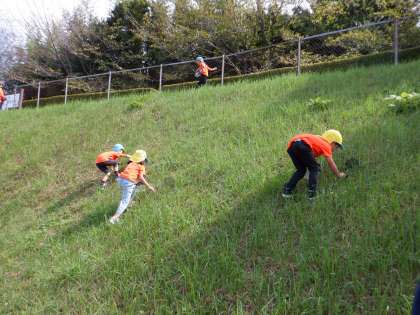お弁当の後は、原っぱで虫捕りをしました。バッタがたくさんいました。虫を追いかけたり、斜面を駆け上ったりして自然の中でのびのびと遊びました。