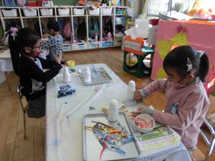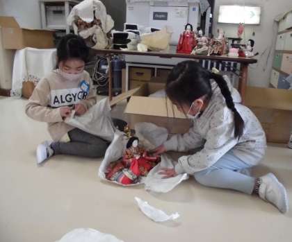 1年振りに出す雛人形は、すみれ組が一つ一つ丁寧に扱いながら並べるのを手伝いました。