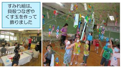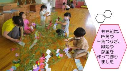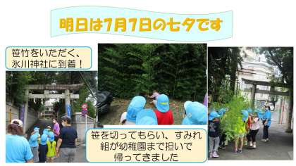 明日は晴れるかな? 公開日 2021/07/06 更新日 2021/07/06 子どもたちの様子 七夕に向けて、各学級で笹飾りを作りました。年長すみれ組が地域の氷川神社さんに笹をもらいに行き、一人一人飾りを付けました。みんなのお願いが叶うといいですね!