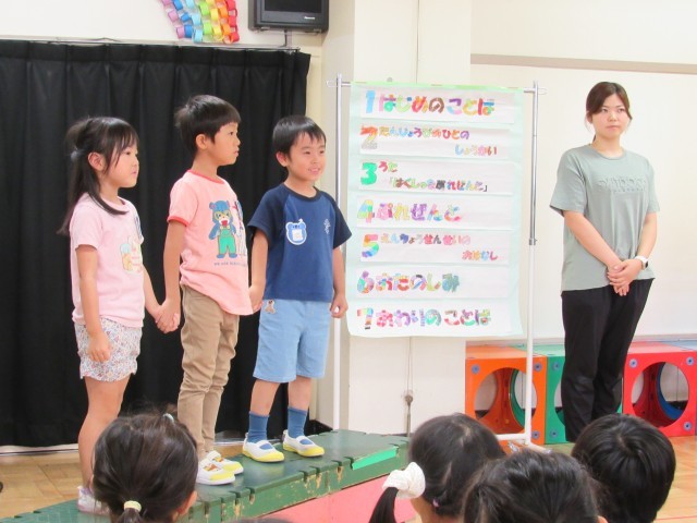 7月15日 7月の誕生会 公開日 2025/07/15 更新日 2025/07/15 園日記 今日は7月生まれの友達の誕生会を行いました。 お楽しみは、園長先生のくじらの歌やおおきなたいこ ちいさなたいこ♪ みんなで盛り上がりました。 すみれ組はプレゼントづくりだけでなく、司会にも取り組み、どんどん上手になっています。 +2