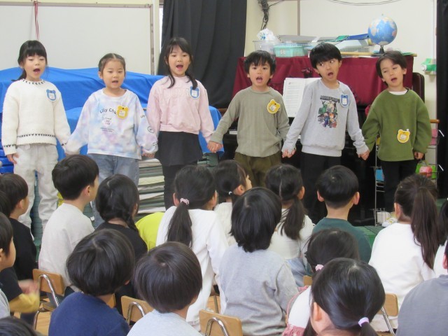 当日は、たんぽぽ組の子どもたちは少し緊張した表情を浮かべながらも、すみれ組と一緒に司会台に立ち、教えてもらった言葉をしっかりと話すことができました。すみれ組の頼もしい姿と、たんぽぽ組の一生懸命な姿がとても微笑ましい時間となりました。