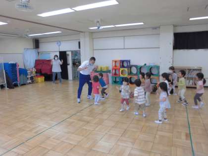 ちゅうるっぷ組は かにさん歩きなど、どうぶつものまね動きをつる先生と一緒にしました。