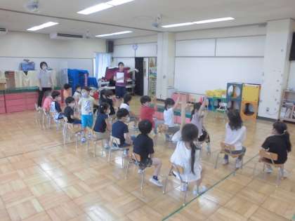 写真の様子は、誕生会前日のすみれ組の様子です。年長さんとして誕生会のリハーサル風景です。