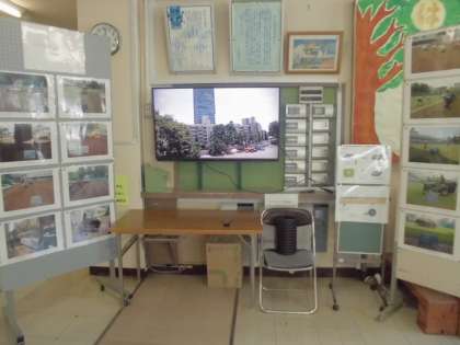 先日、隣接の小学校正面玄関のディスプレーのコーナーに芝生化コーナーを設置しました。