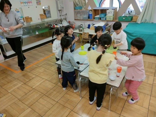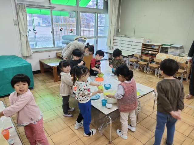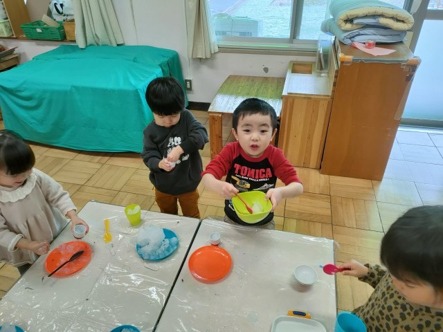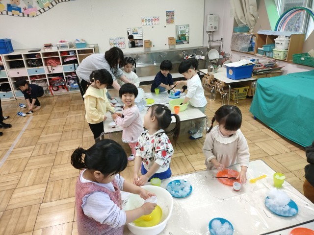ちゅうりっぷの教室 降った雪で遊んでいました。 かき氷を作るのかな??