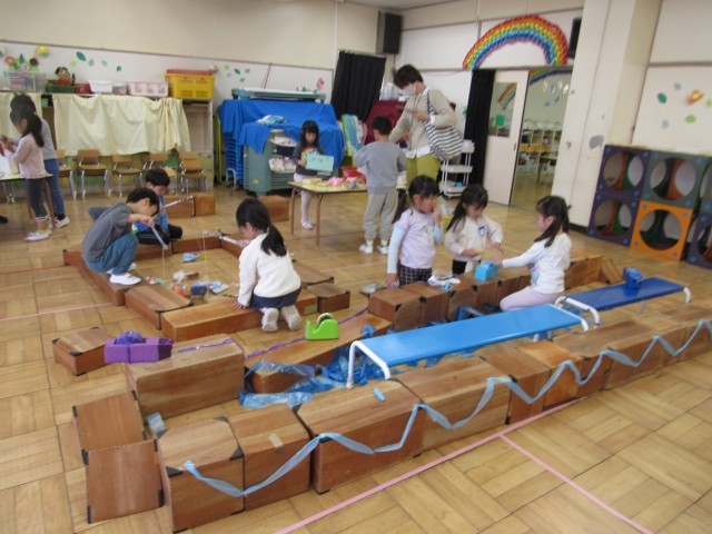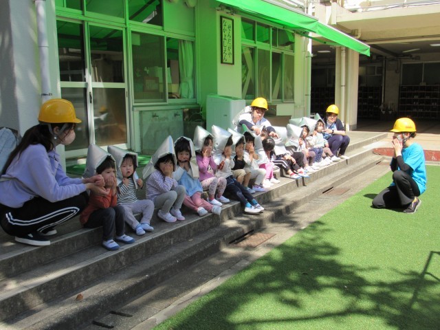 ちゅうりっぷ組は、その様子を今回は部屋の前から見学。今日は5分ちょっとで避難完了。お兄さんお姉さんのお手本を参考に来月からはちゅうりっぷ組も一緒に校庭避難等、行っていきます。