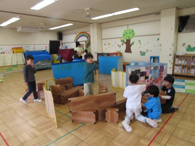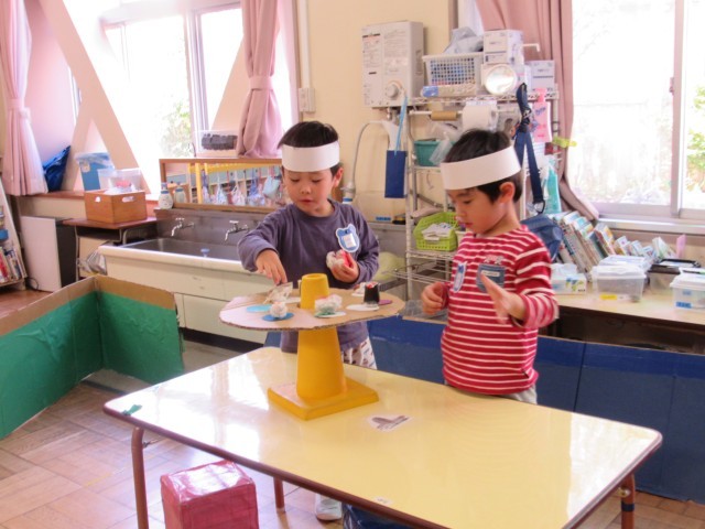 ザリガニのお世話当番など、年長になり当番の仕事も頑張っています。ホールに遊びの場も広がり、友達と迷路をつくったり、保育室では回転ずしごっこを楽しんだりしていました。