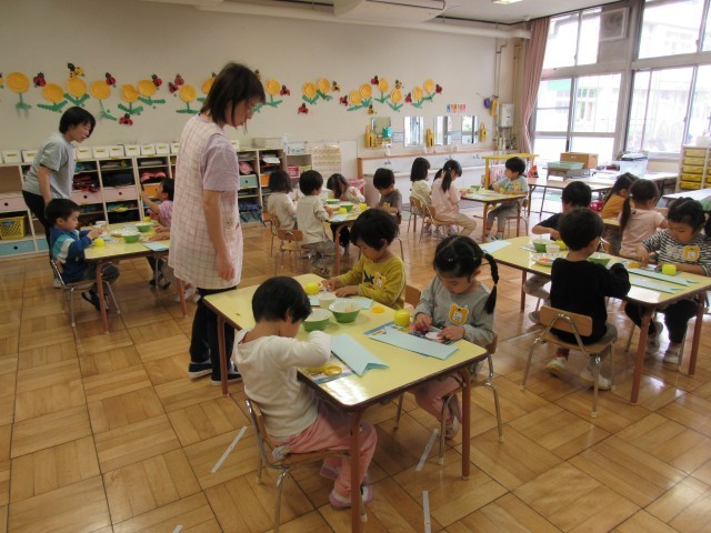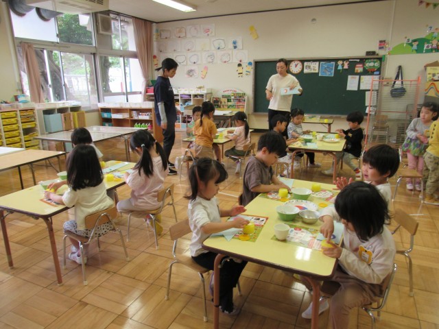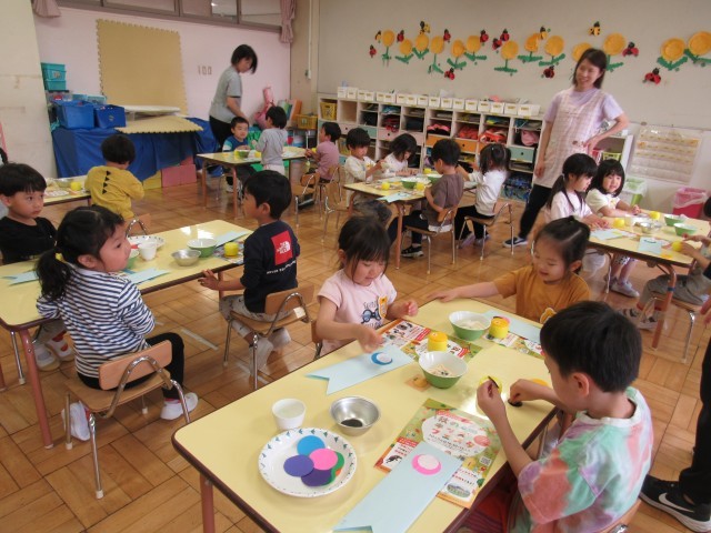 たんぽぽ組になって初めて、個人もちの糊を使って、こいのぼりの目をつけました。