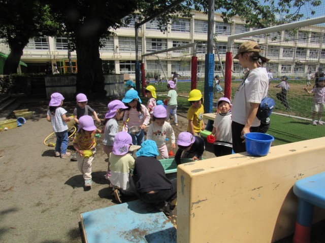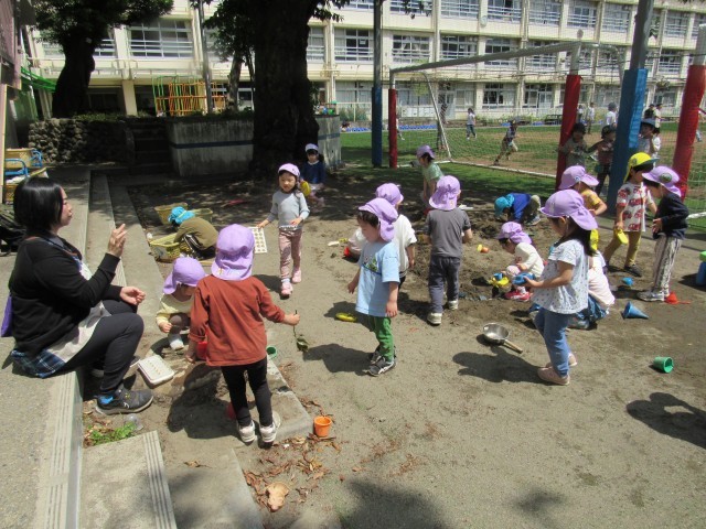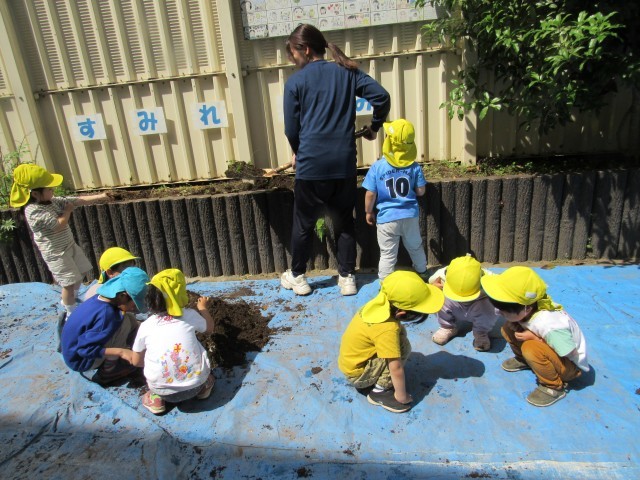 たんぽぽ組、すみれ組は夏野菜などの栽培にあたり、土づくりを行いました。雑草などをとりのぞき、古い土に肥料を混ぜて、何を植えるか楽しみです。発見した幼虫やナメクジなどの虫にも興味津々です。ちゅうりっぷ組は砂場で、ちょっぴり水も使って感触を楽しみながら遊びました。
