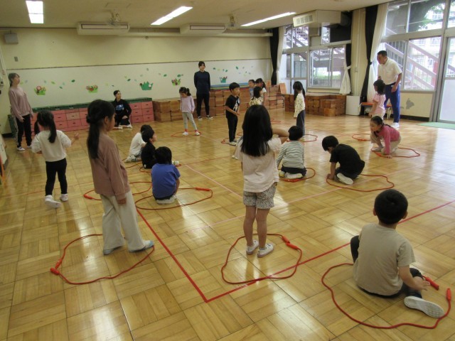すみれ組もスキップやギャロップなどの動き、そして個人縄跳びを使って縄のおうちに鬼に捕まらないように逃げるなど、