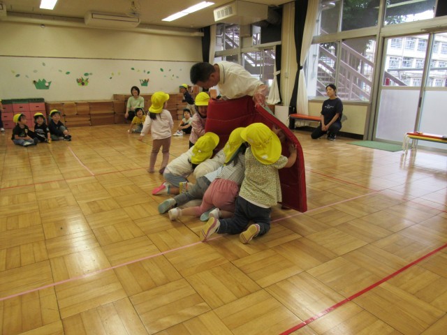 たんぽぽ組は赤マット鬼、青鬼マット鬼に捕まらないよう逃げたり、力を入れて押したり、