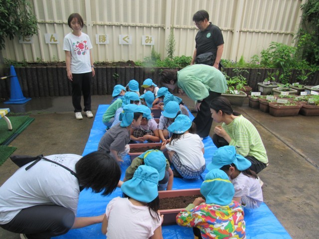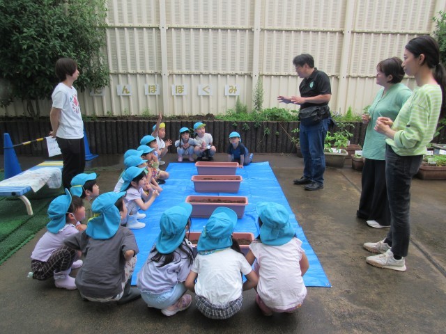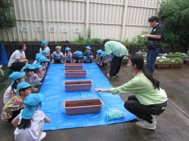 6月11日 【すみれ組】藍の種まき 公開日 2025/06/12 更新日 2025/06/12 園日記 地域コーディネーターやネコの額ファームさんの方々が来園くださり、藍の種まきをすみれ組に伝授くださいました。 藍についてのお話をくださり、まいた種が生長したら収穫して、たたき染めも教えてくださるそうです。 楽しみにしっかりお世話していきたいと思います。 藍の種まきで地域の方々の愛もいただいたあたたかな時間でした。ありがとうございます。 +1