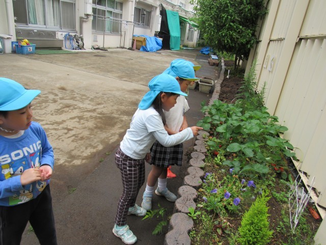 5月に園庭にできたイチゴをすみれ組の当番を中心に収穫しました。