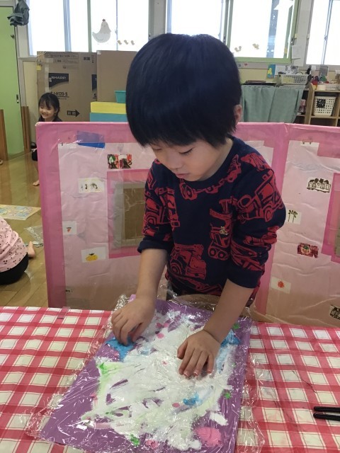 様々な色の絵の具を手で伸ばして体の形にしました。最後に目と口を貼り付け、カラフルな『おばけ』ができあがりました。