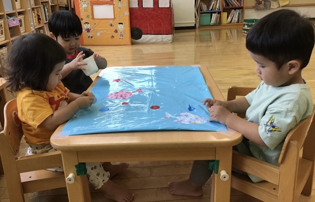 スポーツデーの日に立てる登り旗を作りました。「海」のテーマに合わせて魚やキラキラしたシールなどを当日が待ち遠しい様子で、楽しそうに貼り付けていました。