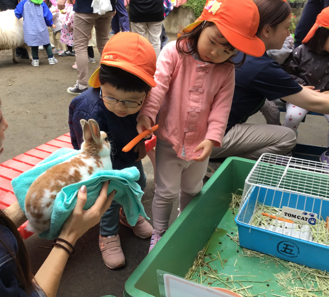 「フワフワしてる!」「かわいいね!」ひつじやうさぎなどの動物にエサをあげたり、抱っこをしたりと触れ合いを楽しみました。