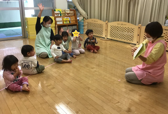 名前を呼ばれたら元気にお返事!気持ちの良い朝のスタートです。季節のうたを歌い、お気に入りの絵本を読んでもらうのも楽しみのひとつになっています。