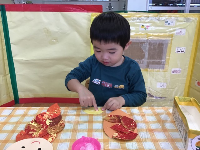 丸めた新聞紙で画用紙にスタンプをして『みのむし』の体を作りました。最後に目や口を描き、可愛らしい仕上がりになりました。