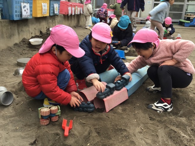 トンネルを繋げて電車を走らせたり、5歳児に手伝ってもらいながら山を作ったりして遊びました。「できた!」「すごい!」と嬉しそうな声が聞かれました。