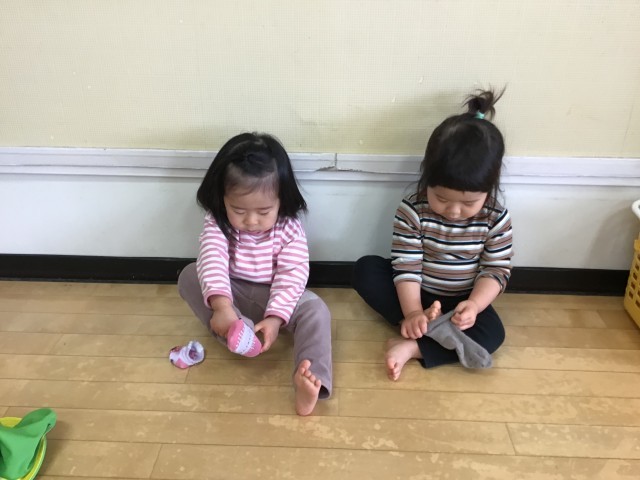 「よいしょ!」少し難しい靴下も「自分で!」と頑張っています。上手くできると嬉しそうな表情を浮かべ、ご機嫌で出発です。