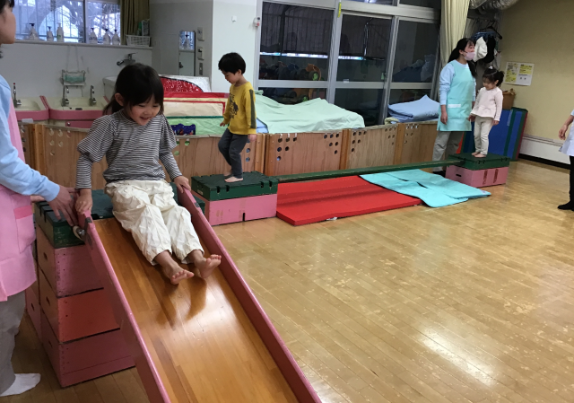 巧技台などを組み合わせて滑り台、一本橋をつくり、アスレチック遊びをしました。みんな元気いっぱいに体を動かしていました。