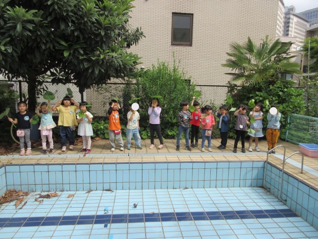 4月22日。プールの横に生えているフキがぐんと伸びてきました。今日は、みんなで収穫です。フキを手に持つと、やっぱり傘にしてみたくなる子供たちでした!