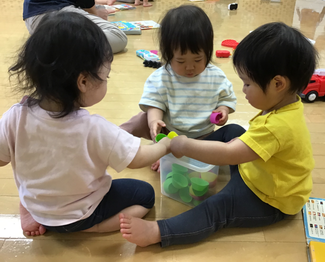 室内遊び(1歳児 ひよこ組) 公開日 2025/05/07 更新日 2025/05/07 かきっこ通信 少しずつ園の生活に慣れ、友だちと触れ合う時間も増えてきました。穴の開いたケースにシリコンカップを入れる遊びが人気で、繰り返し楽しんでいます。