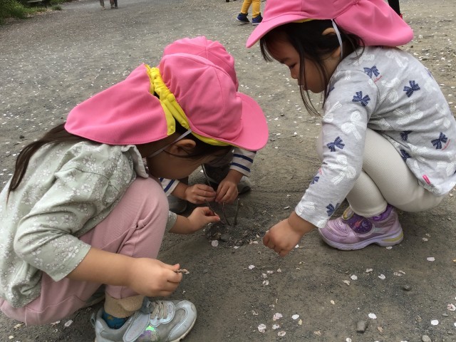 散歩(3歳児 うさぎ組) 公開日 2025/05/07 更新日 2025/05/07 かきっこ通信 砂を集めて木の枝や桜の花びらをデコレーションし、ケーキを作っていました。「ここにも付けよう!」「誕生会しよう!」と、大盛り上がりでおままごとを楽しんでいました。