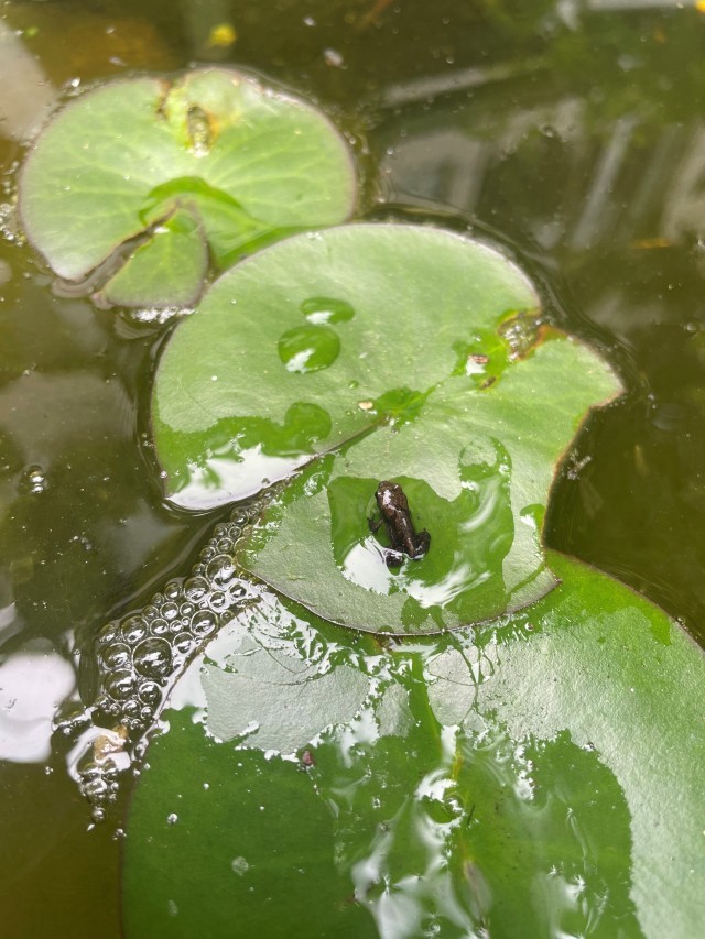 子どもたちがそっと水の中をのぞいているい小さな池に、小さなアズマヒキガエルとオタマジャクシが仲間入りしました。東京都では、とても数が少なくなっているというアズマヒキガエル。子どもたちと触れ合って遊びながら親しみをもってほしいと願い、渋谷区立臨川幼稚園の池からいただいたものです。