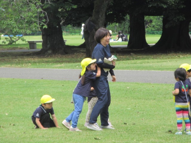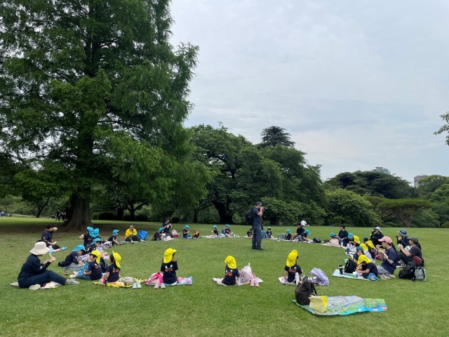 新宿御苑では、小川の飛び石を渡って「母と子の森」を探検したり、幼稚園では見たことのない昆虫を見付けたり、大きな木々でかくれんぼ、広い芝生で追いかけっこ、サクランボやユリノキの実拾いなど、自然と触れ合いながらたくさん体を動かして遊びました。