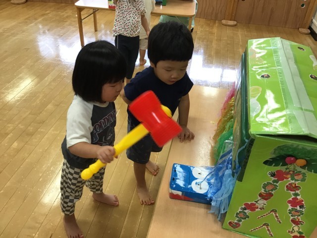 出てくるワニをピコピコハンマーでタイミングよく狙い、繰り返しゲームを楽しみました。