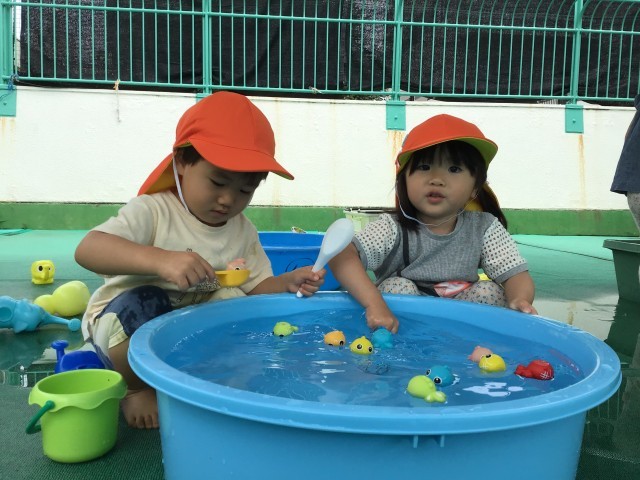 「おさかな釣れたよ!」水の気持ちよさを感じながら思いっきり水あそびを楽しみました。
