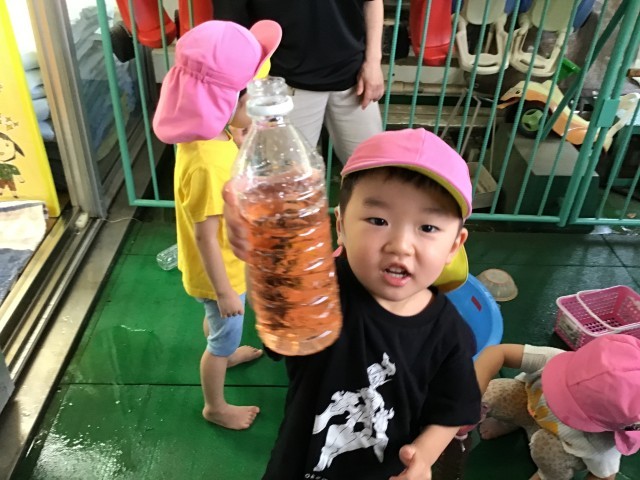 色水をジュースに見立てたり、「どんな色になるかなー?」と様々な色を混ぜ合わせて遊びました。