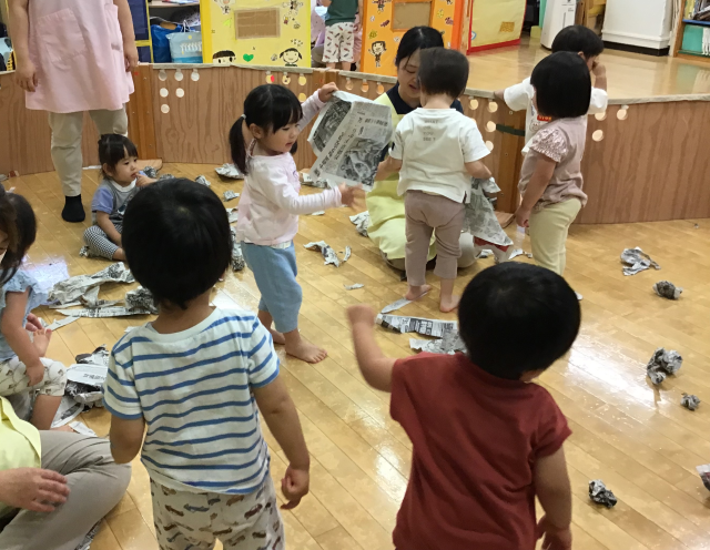 ビリビリ新聞紙あそび(1~2歳児) 公開日 2025/07/08 更新日 2025/07/08 かきっこ通信 新聞紙をちぎったり、丸めて投げたりして遊びました。ちぎった新聞紙が上から降ってくると「あめだー!」と大はしゃぎでした。