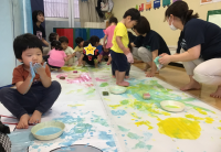 部屋いっぱいに大きな模造紙を広げ、手や足に絵の具を付けて思いっ切り描くことを楽し...